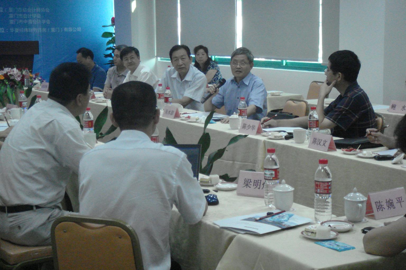 2011年8月18日下午,由廈門市總會計師協(xié)會、廈門市會計學(xué)會和廈門市中直會計學(xué)會聯(lián)合主辦、華夏經(jīng)緯財務(wù)咨詢(廈門)有限公司協(xié)辦的題為“當(dāng)前經(jīng)濟形勢與企業(yè)財務(wù)管理”的主題論壇在廈門富興大廈B幢8樓華夏經(jīng)緯會議室成功舉辦。參加論壇的有廈門市財政局領(lǐng)導(dǎo),廈門市總會計師協(xié)會、廈門市會計學(xué)會、廈門市中直會計學(xué)會常務(wù)理事,廈門大學(xué)吳水澎、陳漢文、陳少華、傅元略等會計學(xué)資深教授、博導(dǎo),美國管理會計師協(xié)會IMA中國代表李蔚,以及部分企業(yè)總會計師、財務(wù)總監(jiān)等。