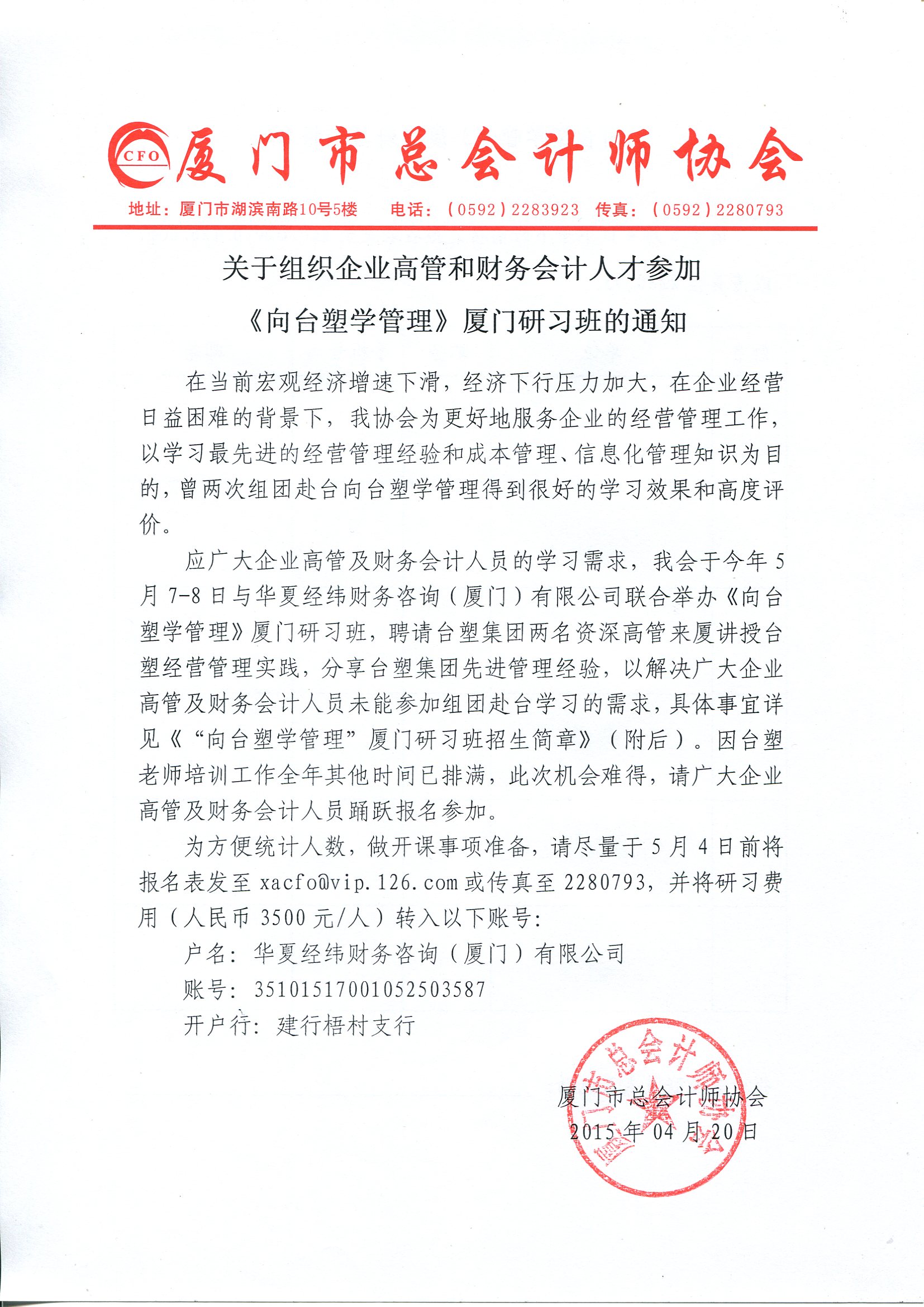 關(guān)于組織企業(yè)高管和財(cái)務(wù)會(huì)計(jì)人才參加《向臺(tái)塑學(xué)管理》廈門研習(xí)班的通知